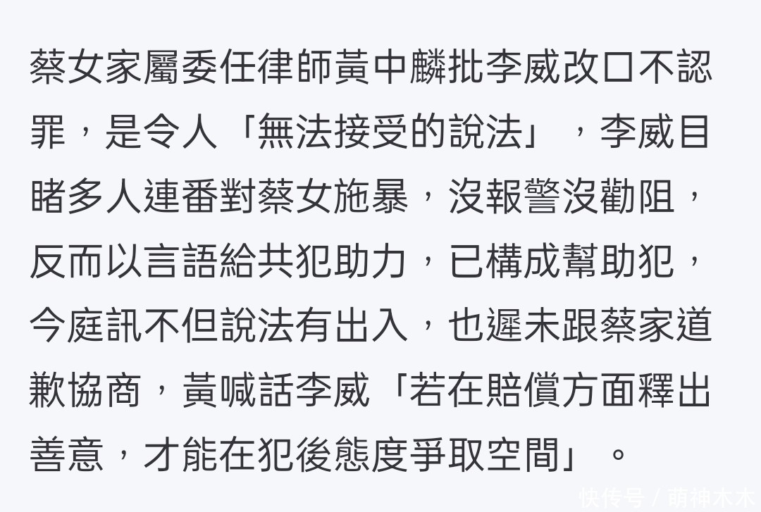 回顾李威与受害者家属的态度,也发现关键点是合理赔偿。在去年的庭审中,李威在转为污点证人后当庭表示不认罪,称鼓励蔡女士“勇敢道歉就没事”是出于同情,无伤害意图,而且自己是在事件发生后才被动加入群组。当时受害者家属委托律师还在庭上批评李威的翻供让人无法接受,家属表示该案发一年多来没有接到任何被告一句道歉,甚至公开催促李威积极谈赔偿,才能争取宽容。